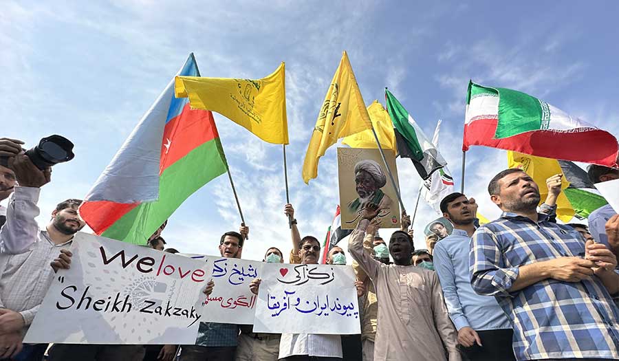 وكان ينتظر هؤلاء الأشخاص وصول الشيخ الزكزاكي رافعين صور هذا الزعيم الشيعي في نيجيريا واللواء الشهيد سليماني وقائد الثورة الإسلامية سماحة آية الله خامنئي.